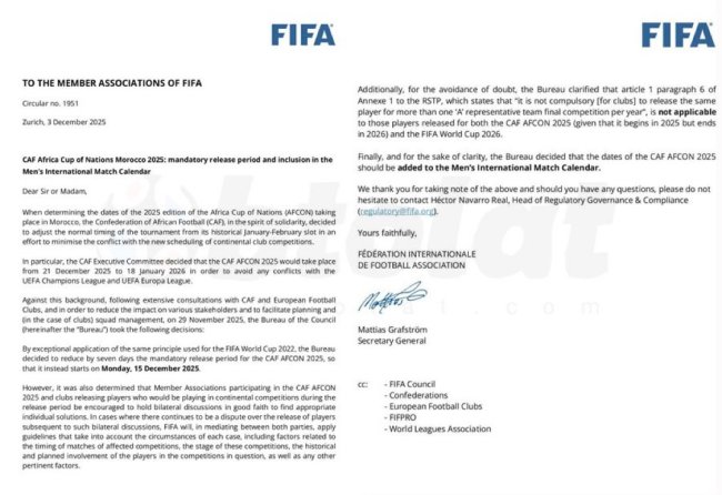 La circulaire rappelle le contexte particulier de cette édition. Traditionnellement jouée en janvier-février, la CAN a été décalée à la période du 21 décembre 2025 au 18 janvier 2026 . Selon la FIFA et la CAF, ce glissement vise à « minimiser les conflits » avec le nouveau format de la Ligue des Champions et de la Ligue Europa de l’UEFA.