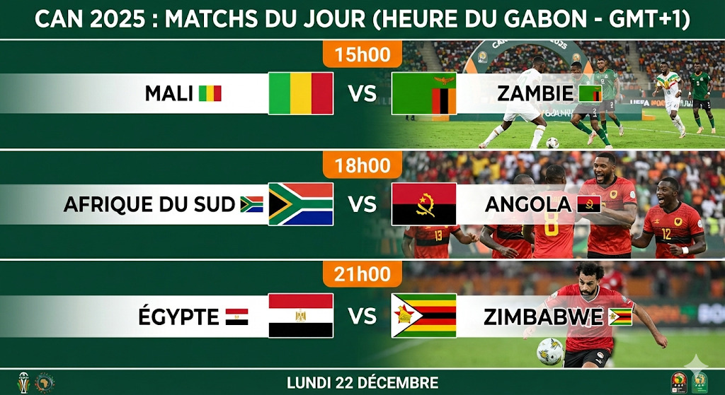 La 35ème édition de la Coupe d’Afrique des Nations est définitivement lancée ! Après une soirée d’ouverture incandescente hier, où le pays hôte a tenu son rang face aux Comores (2-0), la compétition passe la seconde ce lundi 22 décembre. Trois affiches alléchantes sont au menu, marquant l’entrée en lice des autres pensionnaires du Groupe A et des cadors du Groupe B. Amis Gabonais, préparez-vous à une journée 100% foot, sans aucun décalage horaire !
