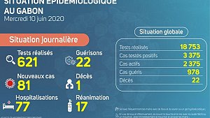 Nous avons enregistré 73 nouveaux cas positifs sur 7 086 tests réalisés, soit un taux de positivité de 1%, 18 personnes hospitalisées dont 10 en réanimation pour détresse respiratoire, 102 nouvelles guérisons et 01 nouveau décès à Port Gentil.