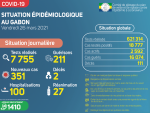 Situation épidémiologique Nous avons enregistré 351 nouveaux cas positifs sur 7 755 tests réalisés, soit un taux de positivité de 4.5%, 100 personnes hospitalisées dont 27 en réanimation pour détresse respiratoire, 211 guérisons et 02 nouveaux décès notifiés à Libreville. La répartition des nouvelles contaminations est comme suit (…) -