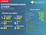 Situation épidémiologique Nous avons enregistré 61 nouveaux cas positifs sur 4 301 tests réalisés, soit un taux de positivité de 1.4%, 44 personnes hospitalisées dont 14 en réanimation pour détresse respiratoire, 207 nouvelles guérisons et 01 nouveau décès à Libreville. La répartition des nouvelles contaminations est comme suit : (…)