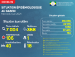 Situation épidémiologique Nous avons enregistré 106 nouveaux cas positifs sur 7 004 tests réalisés, soit un taux de positivité de 1.5%, 40 personnes hospitalisées dont 18 en réanimation pour détresse respiratoire, 368 nouvelles guérisons et 01 nouveau décès à Port Gentil. La répartition des nouvelles contaminations est comme suit : (…) -
