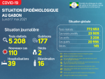 Situation épidémiologique Nous avons enregistré 110 nouveaux cas positifs sur 5 208 tests réalisés, soit un taux de positivité de 2.1%, 39 personnes hospitalisées dont 16 en réanimation pour détresse respiratoire, 177 nouvelles guérisons et 02 nouveaux décès à Libreville. La répartition des nouvelles contaminations est comme suit : (…)