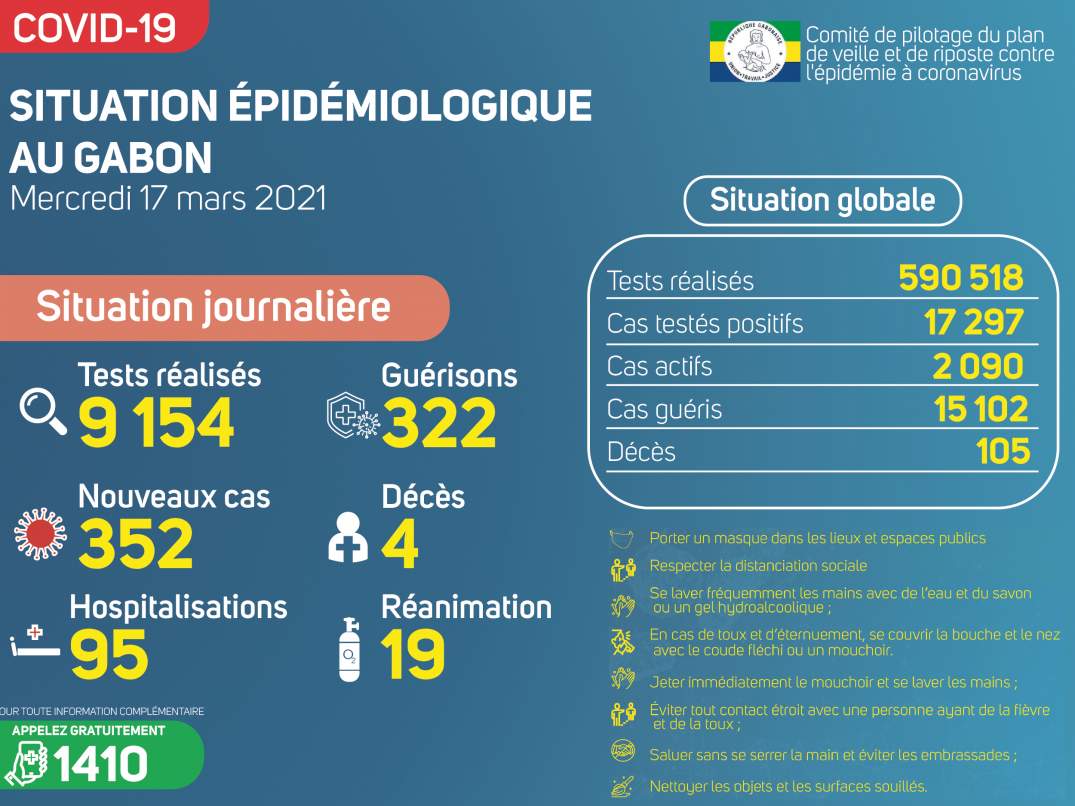 Gabon Matin vous livre le point journalier du Comité de pilotage du plan de veille et de riposte contre l’épidémie à Coronavirus au Gabon du 17 mars 2021.