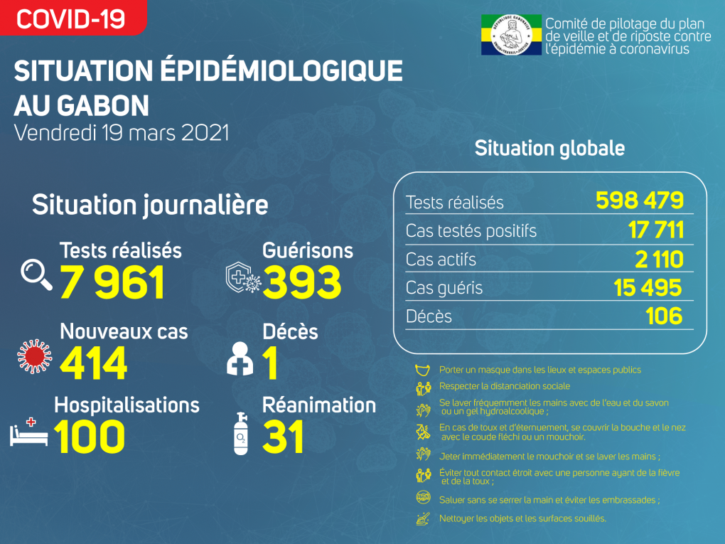 Gabon Matin vous livre le point journalier du Comité de pilotage du plan de veille et de riposte contre l’épidémie à Coronavirus au Gabon du 19 mars 2021.