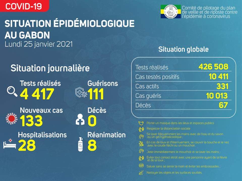 Gabon Matin vous livre le point journalier du Comité de pilotage du plan de veille et de riposte contre l’épidémie à Coronavirus au Gabon du 25 janvier 2021.