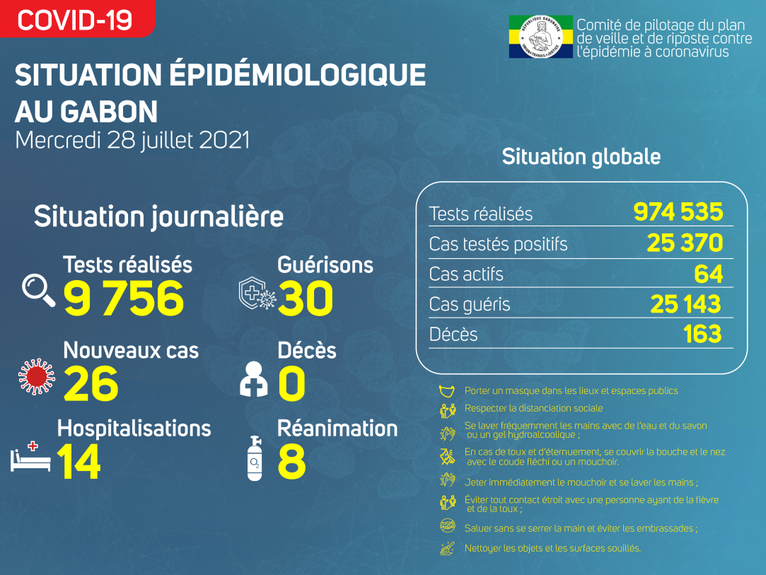 Gabon Matin vous livre le point journalier du Comité de pilotage du plan de veille et de riposte contre l’épidémie à Coronavirus au Gabon du 28 juillet 2021.