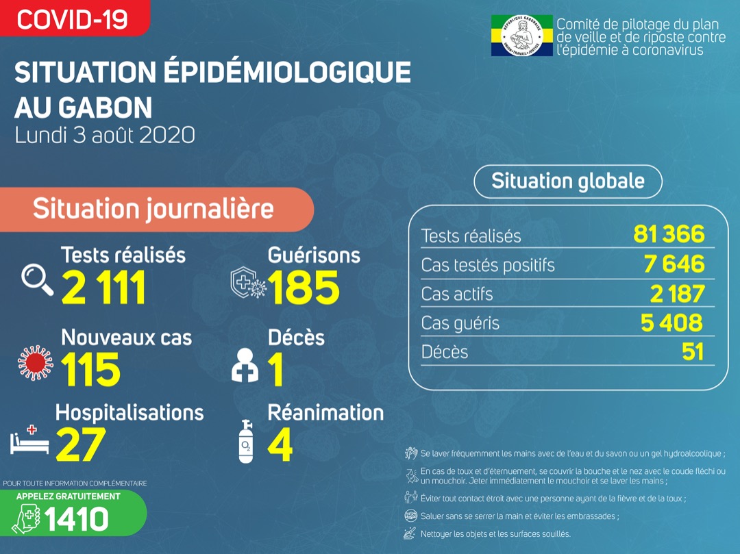 Gabon Matin vous livre le point journalier du Comité de pilotage du plan de veille et de riposte contre l’épidémie à Coronavirus au Gabon du 3 août 2020.