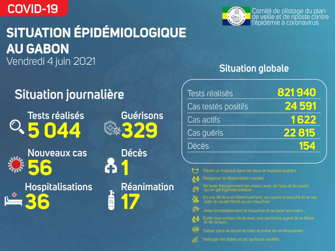 Nous avons enregistré 56 nouveaux cas positifs sur 5 044 tests réalisés, soit un taux de positivité de 1.1%, 36 personnes hospitalisées dont 17 en réanimation pour détresse respiratoire, 329 nouvelles guérisons et 01 nouveau décès à Libreville.