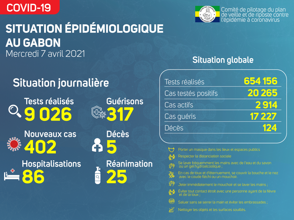 Nous avons enregistré 402 nouveaux cas positifs sur 9 026 tests réalisés, soit un taux de positivité de 4.5%, 86 personnes hospitalisées dont 25 en réanimation pour détresse respiratoire, 317 guérisons et 05 nouveaux décès notifiés à Libreville.