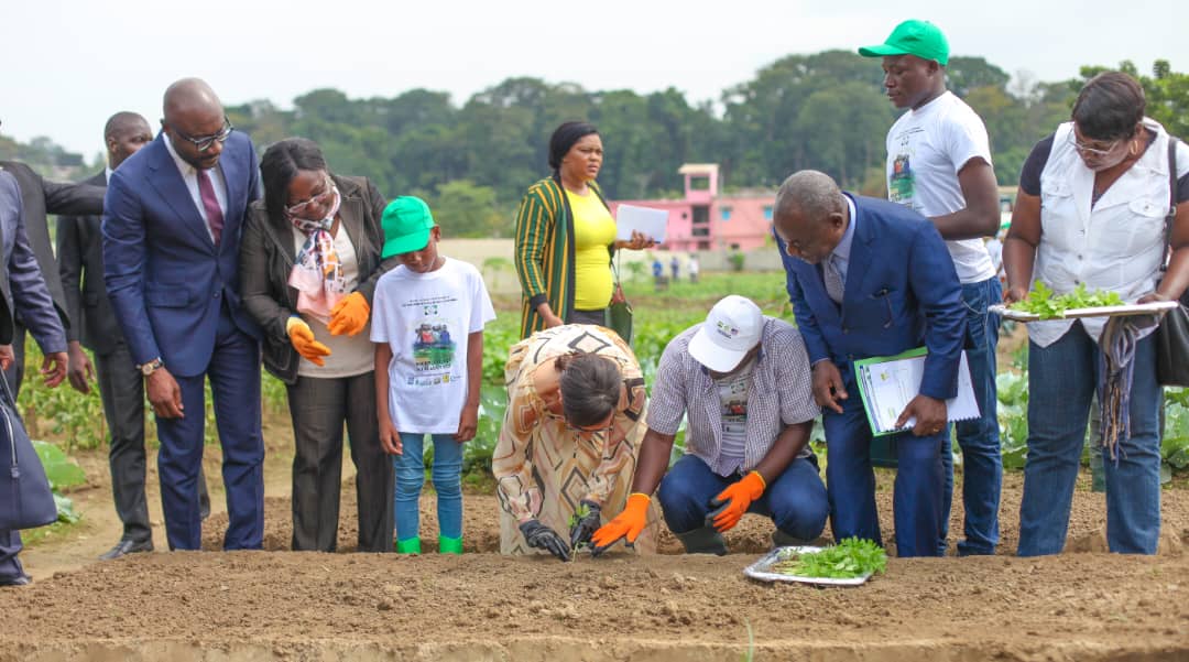 Pour clore cette cérémonie de lancement de l’édition 2019 des vacances agricoles, Mesdames Sylvia Bongo Ondimba et Augustine Nkoghe Bekale accompagnées du ministre Biendi Maganga Moussavou et des vacanciers ont pris part à deux activités de planting et de récolte de laitue.