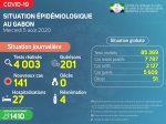 En matière de surveillance épidémiologique, sur les 4 003 prélèvements effectués, nous avons enregistré 141 nouveaux cas positifs, soit un pourcentage de 3,5%. Les cas sont répartis comme suit : Estuaire : 117 nouveaux cas positifs sur 3 896 prélèvements à Libreville, soit un total de 5 567 cas confirmés ; (…) -