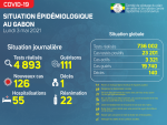 Situation épidémiologique Nous avons enregistré 126 nouveaux cas positifs sur 4 893 tests réalisés, soit un taux de positivité de 2.5%, 55 personnes hospitalisées dont 22 en réanimation pour détresse respiratoire, 111 nouvelles guérisons et 01 nouveau décès à Lambaréné. La répartition des nouvelles contaminations est comme suit : (…)