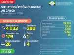 Situation épidémiologique En matière de surveillance épidémiologique, sur les 4 033 prélèvements effectués, nous avons enregistré 179 nouveaux cas positifs, soit un pourcentage de 4,4%. Les cas sont répartis comme suit : Estuaire : 115 nouveaux cas positifs sur 3 836 prélèvements à Libreville, soit un total de 5 406 cas positifs ; (…) -