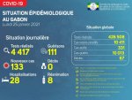 Situation épidémiologique En matière de surveillance épidémiologique, sur les 4 417 prélèvements effectués, nous avons enregistré 133 nouveaux cas positifs, soit un pourcentage de 3%. Les cas sont répartis comme suit : Estuaire : 96 nouveaux cas positifs sur 4 319 prélèvements à Libreville, soit un total de 7 593 cas confirmés ; (…)